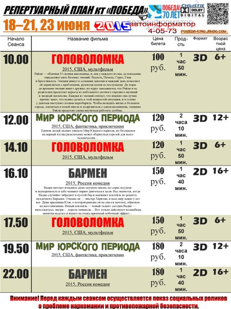 Расписание кинотеатра "Победа" на 18-21, 23 июня: