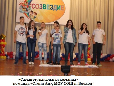 - «Самая музыкальная команда»: команду «Стенд Ап», МОУ СОШ п. Восход;