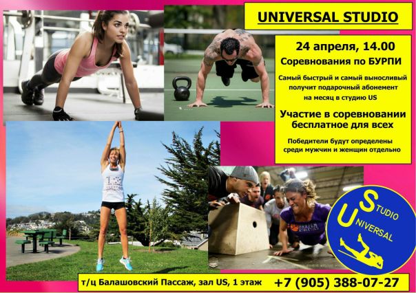 24 апреля в 14.00 в спортивно-оздоровительной студии US состоятся соревнования в кроссфитерском упражнении - БУРПИ, приглашаем всех желающих . Два самых выносливых и быстрых участника получат подарочный абонемент на месяц в наш спортивно-оздоровительную студию US. Победители будут определены среди мужчин и женщин отдельно. Условия выполнения БУРПИ - выполнить максимальное количество БУРПИ за 2 мин.