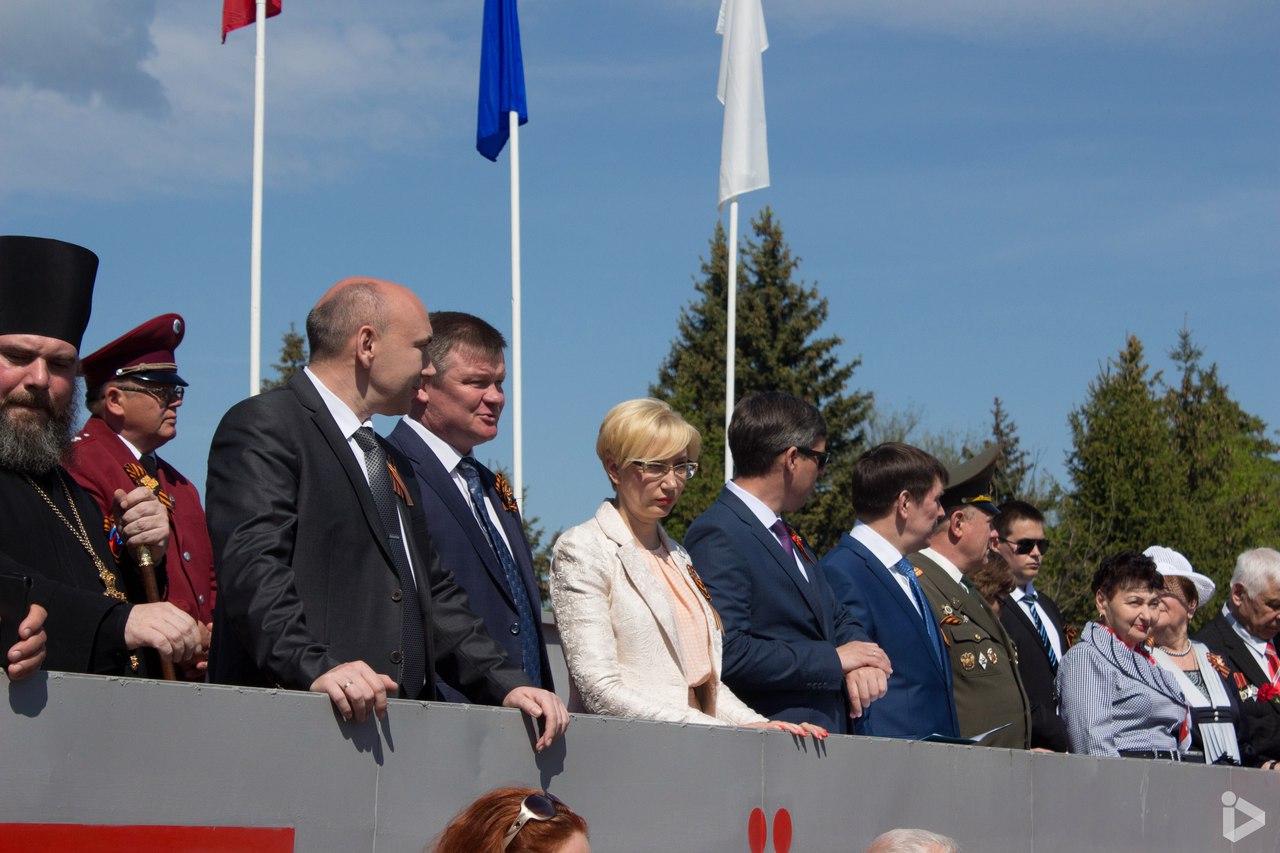 В Балашове власть и духовенство встречали парад с высокой трибуны. Слева направо: епископ Тарасий, глава города Владимир Якубович, сенатор Исаев, глава района Елена Щербакова, глава районной администрации Александр Москалев, депутат облдумы Сергей Гнусарев, военком Виктор Горбунов. Фото отсюда