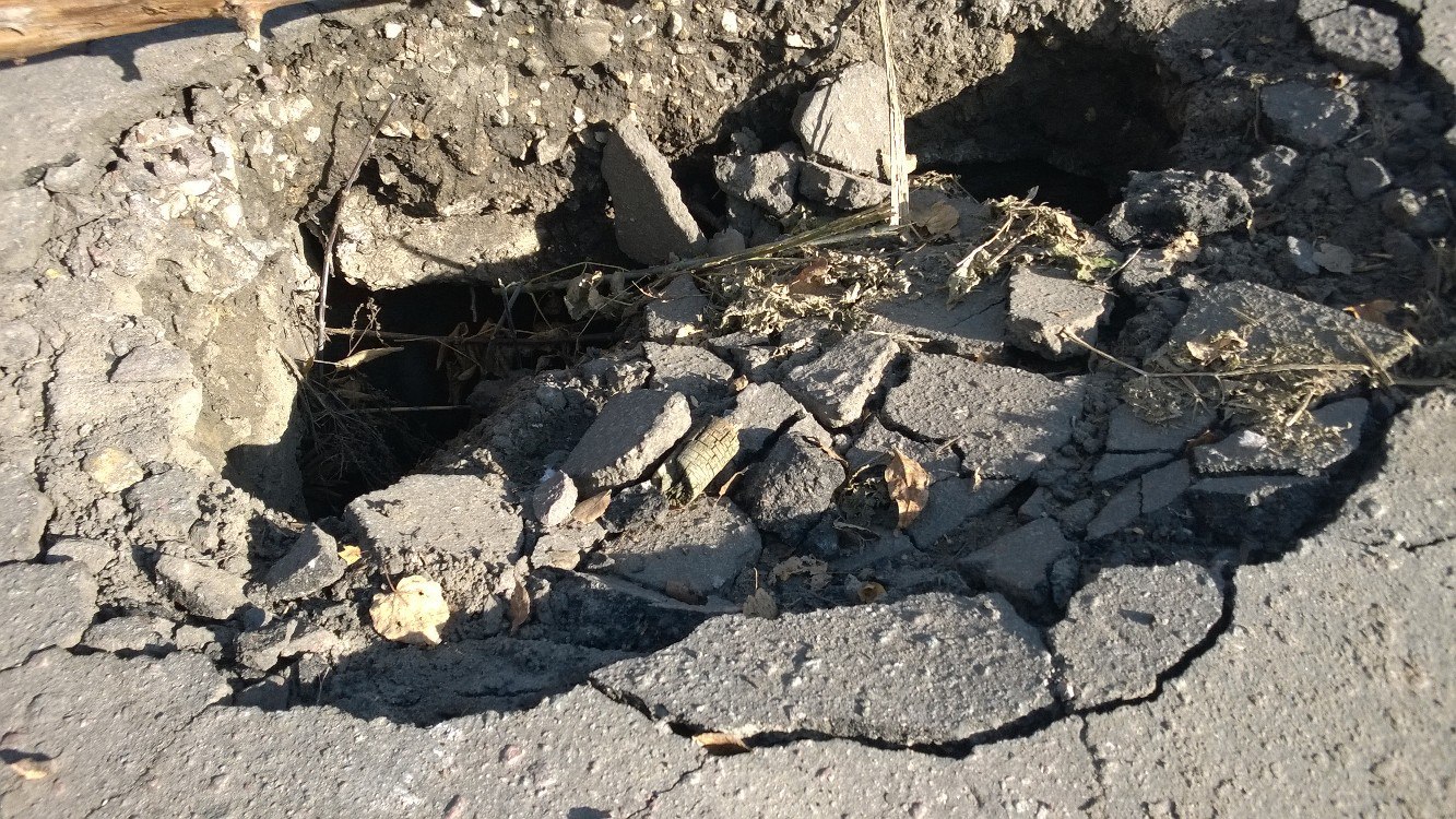Никаких ограждающих лент и специальных знаков на опасном участке нет. Сначала в провал вставляли ветки с листвой, но потом дыру в дороге накрыли сухим сучковатым бревном. Как рассказали Балашоверу жители Пролетарской, это сделали горожане, живущие в расположенных на перекрестке домах. Таким образом балашовцы пытаются оградить водителей от опасности угодить в яму.