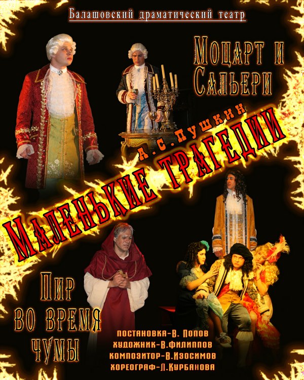19 марта на вечернем показе вашему вниманию будет предложен спектакль «Маленькие трагедии» по пьесам А. Пушкина «Моцарт и Сальери» и «Пир во время чумы». Эта знаковая для нашего театра постановка не оставляет равнодушным ни одного зрителя в зале уже не один год. В спектакле произошла замена: на роль Моцарта и Священника («Пир во время чумы») введен артист Александр Попов.
