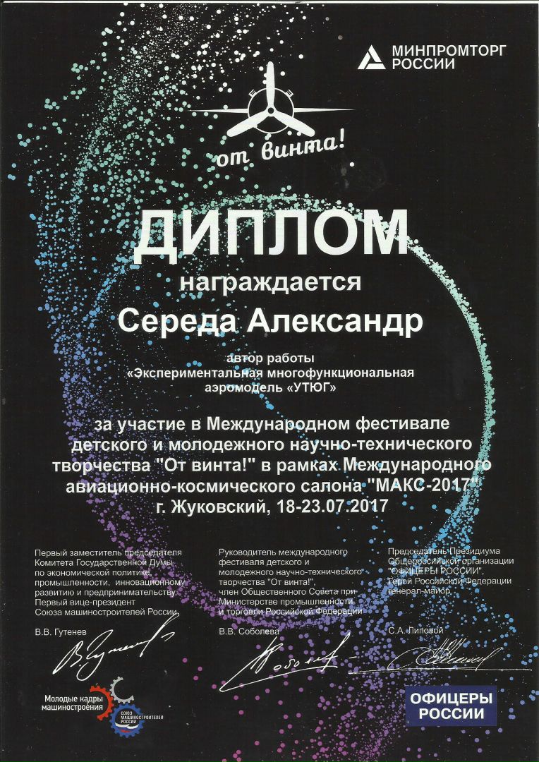 Экспериментальная многофункциональная аэромодель «Утюг» и экспериментальная модель космического щита Земли «Русь» представлялись в секциях «Авиация» и «Космонавтика». Проект экспериментальной модели космического щита Земли в прошедшем учебном году принимал участие в I Всероссийском конкурсе юных инженеров-исследователей «Спутник» под патронатом Самарского национального исследовательского университета имени академика С.П. Королева, а на фестиваль «От винта!» была представлена экспериментальная модель. Аэромодель «Утюг» проектировалась, как ответ на пожелание президента России Владимира Владимировича Путина участникам фестиваля «От винта!» в 2015году сделать не только летающий топор, но и утюг.