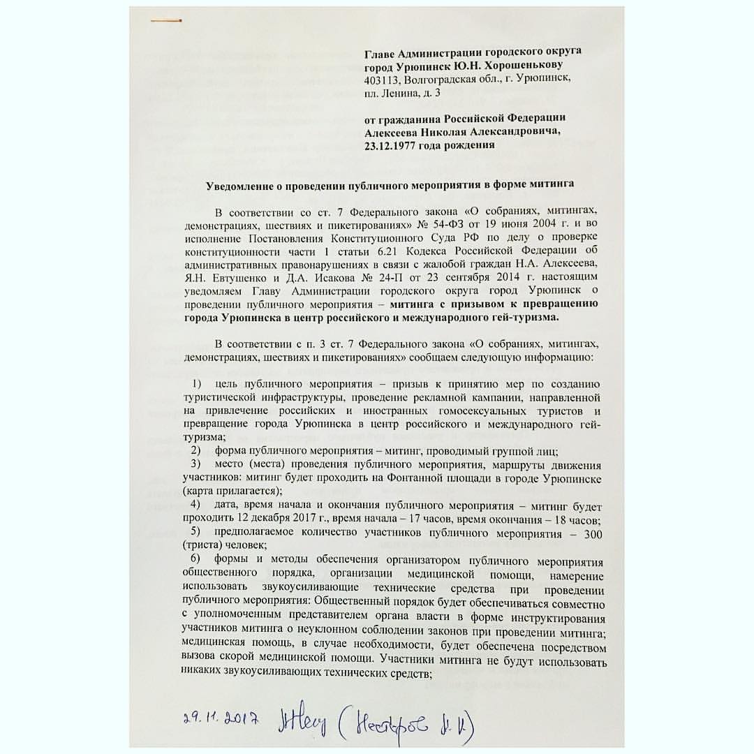 Само заявление по Урюпинску опубликовано в свободном доступе:
