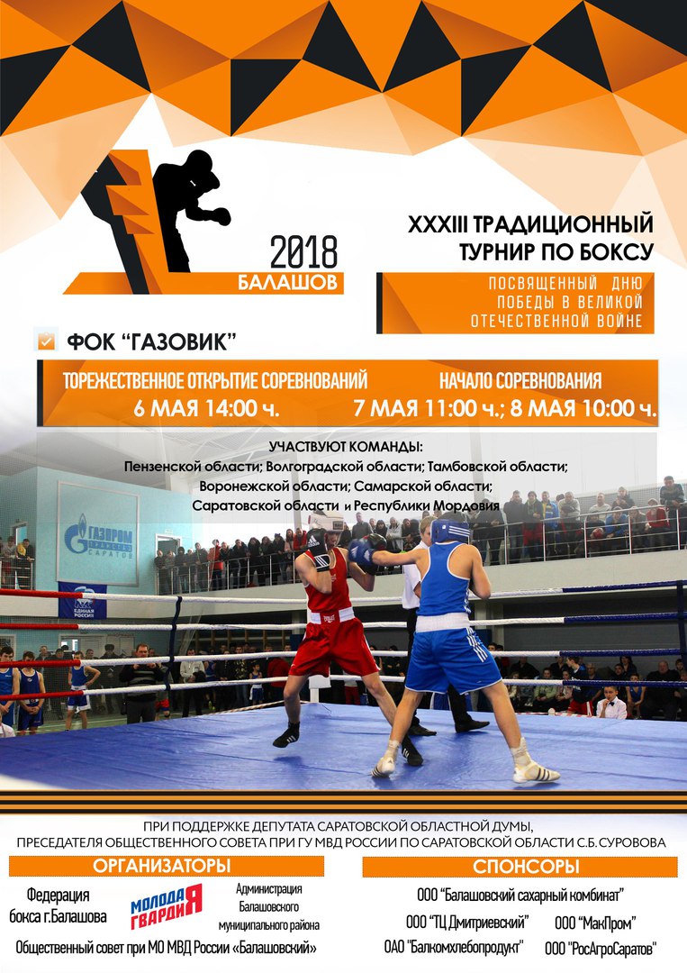 Организатора приглашают жителей города Балашова и Балашовского района на XXXIII традиционный турнир по боксу, посвященный Дню Победы. Организаторы турнира: Федерация Бокса г. Балашова, Общественный Совет при МО МВД России Балашовский, Совет депутатов муниципального образования г. Балашов, Администрация Балашовского муниципального района, БМО ВОО "Молодая Гвардия Единой России".