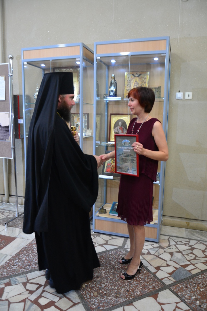 Директор МУ «Балашовский краеведческий музей» Светлана Фетисова поблагодарила епископа Тарасия за плодотворное сотрудничество и вручила ему Благодарственное письмо за большой личный вклад в сохранение и развитие традиций краеведения.