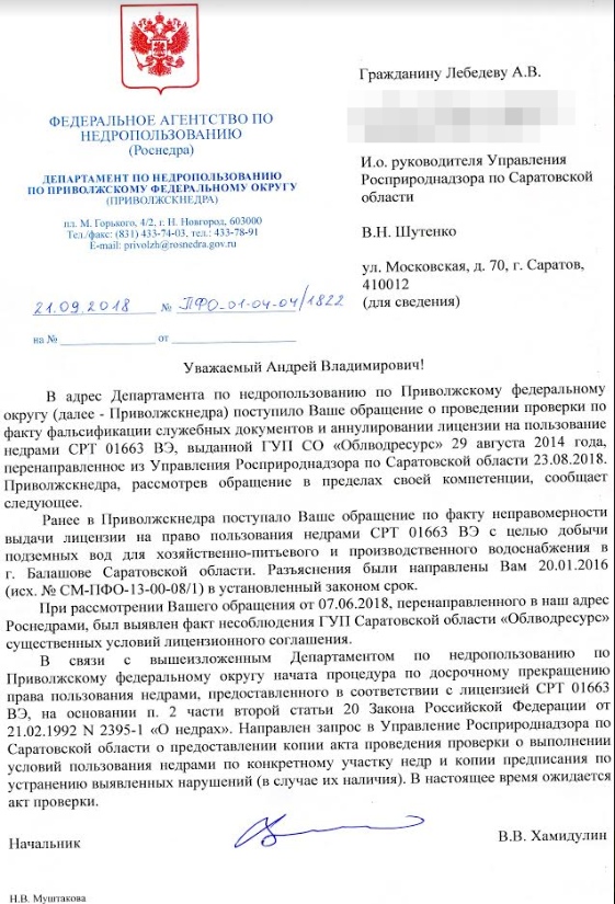 В распоряжении Балашовера оказался ответ федерального ведомства "Роснедра" на запрос горожанина Андрея Лебедева. В письме ведомства, в частности, указывается, что оператор балашовского водозабора "Облводоресурс" не соблюдает условия лицензионного соглашения.