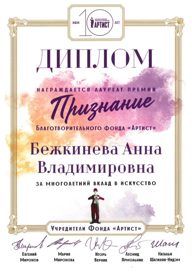 В конце 2018-го года премия «Признание» Благотворительного Фонда «Артист» за многолетний вклад в искусство была вручена талантливому художнику Бежкиневой Анне Владимировне, долгие годы служившей в Балашовском драматическом театре художником-постановщиком.