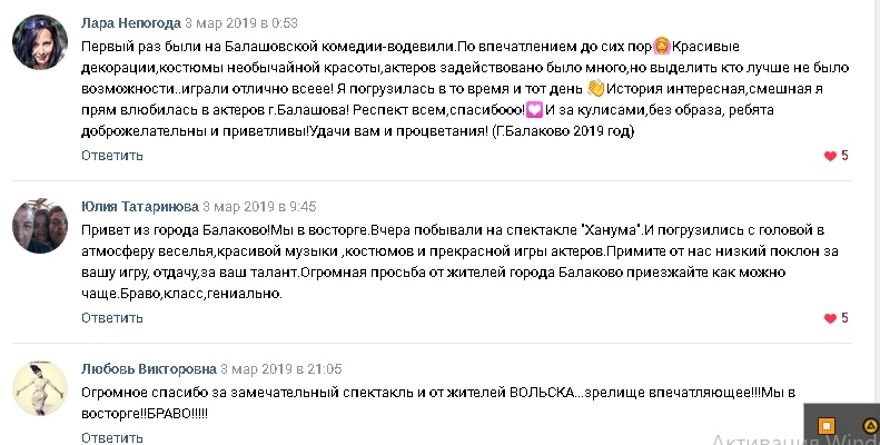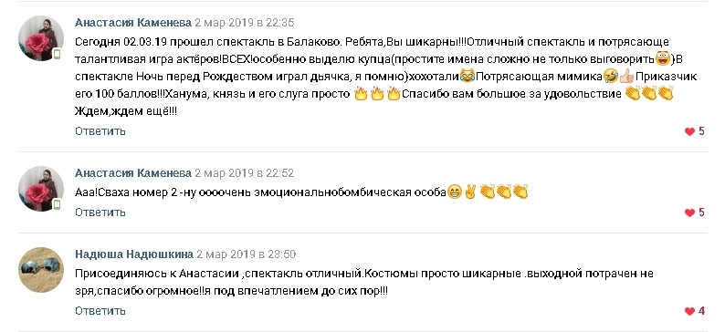 Зрители прекрасно принимали наших артистов и долго не отпускали их со сцены. В подтверждение тому предлагаем прочесть отзывы зрителей, которые вы можете увидеть на станице театра "вКонтакте" https://vk.com/topic-11025454_36391822