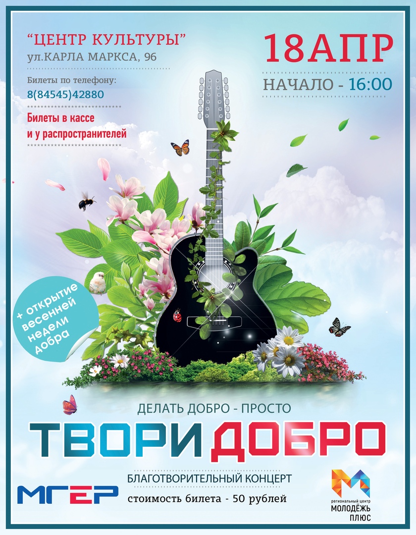 Балашовское местное отделение «Молодой Гвардии», совместно с Балашовским филиалом центра «Молодежь+» проводит 18 апреля в Центре культуры традиционный, IV благотворительный концерт «Твори добро». Время начала концерта - 16.00.