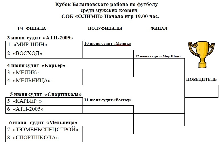 29 мая в управление спорта состоялась жеребьевка Кубка Балашовского района по футболу среди мужских команд, в котором приняли участие 8 футбольных клубов: «АТП-2005», «Мельница», «Карьер», «Мир Шин», «Мелик», «Восход», «Тюменьспецстрой» и «Спортшкола».