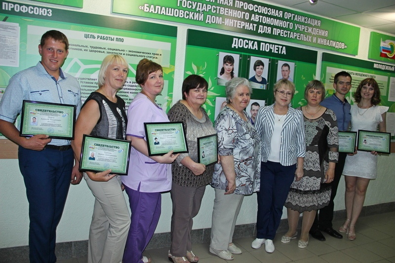 Члены первичной профсоюзной организации Балашовского дома-интерната принимают активное участие областных конкурсах различной направленности, в художественной самодеятельности учреждения, благотворительных и социальных акциях, спортивных и массовых городских мероприятиях. В связи с этим самые активные члены профсоюзной организации получили именные свидетельства о занесении на Доску почёта.